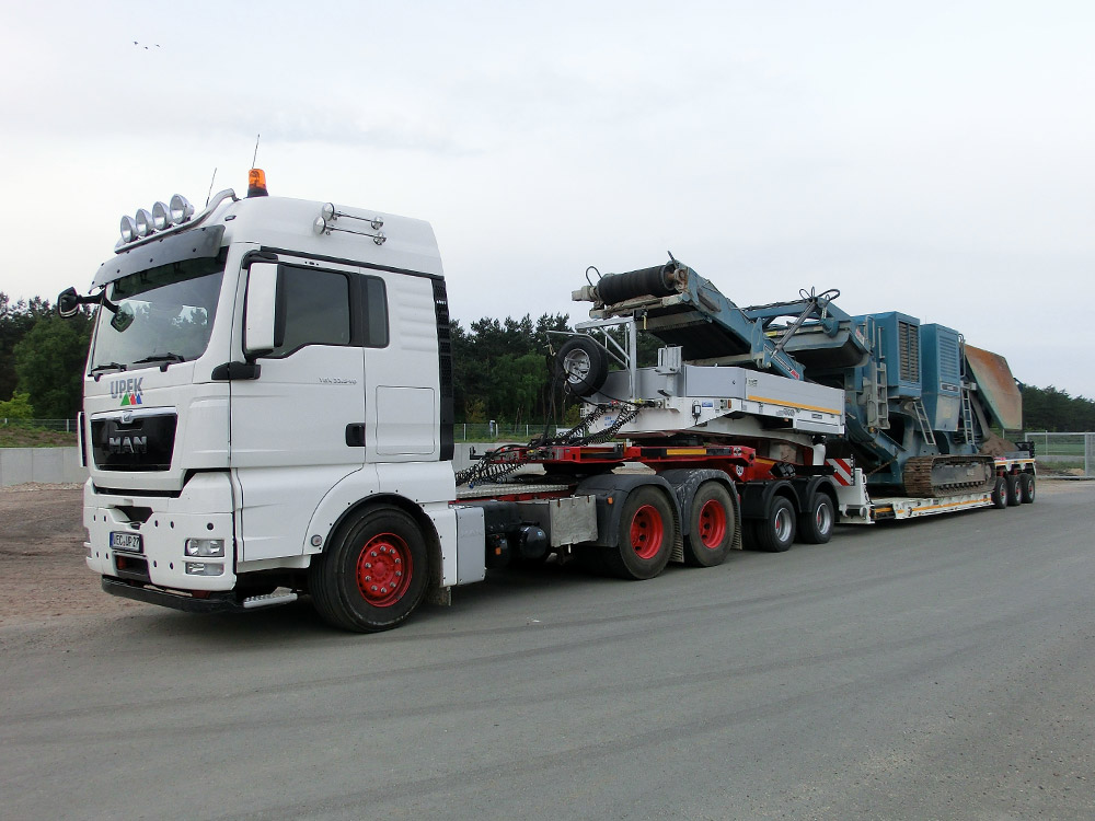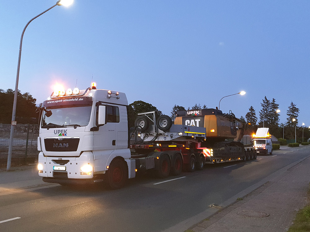 Benötigte Transportgenehmigungen werden von uns beantragt. Ein eigenes BF3-Begleitfahrzeug mit entsprechend geschultem Personal halten wir vor. Eventuell notwendige Polizeibegleitung wird von uns bei Bedarf abgestimmt. Wir transportieren sowohl unsere eigenen Maschinen, als auch Fremdfahrzeuge, Bauwerke, Betonteile etc.